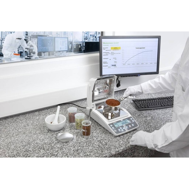 La lampada alogena da 400 W ha l'effetto di ridurre i tempi di analisi, ben 4 metodi di essiccazione a scelta consentano ad ogni operatore di selezionare la modalità più idonea : essicazione standard , essicazione graduale (STEP), essicazione veloce (RAPID) ed essicazione protettiva (SLOW).