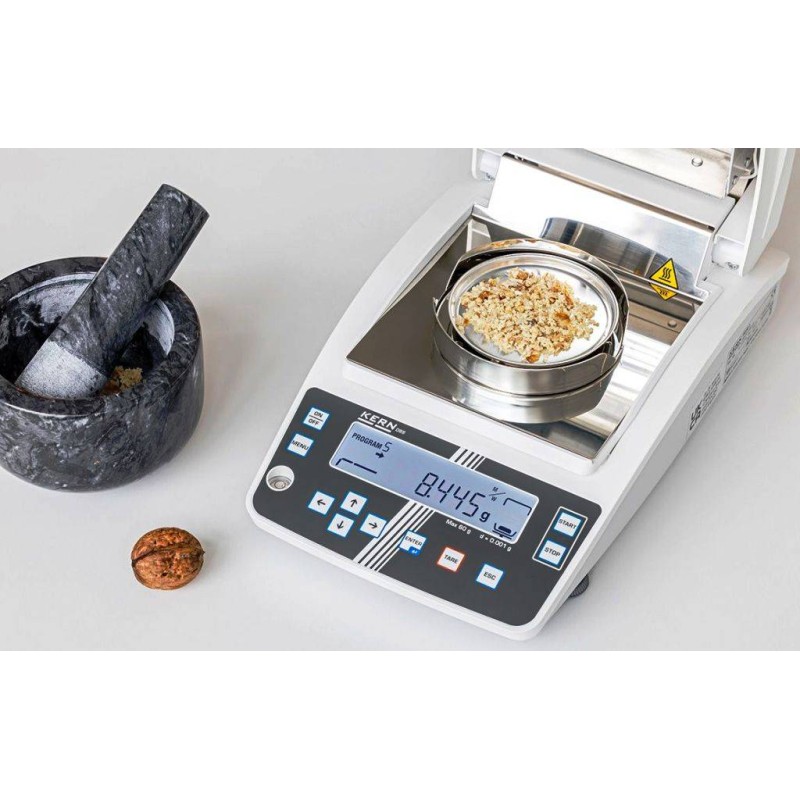 La termobilancia KERN DBS 60-3 può essere considerata una delle termobilance più precise e accurate. Essicca il campione in maniera molto più rapida grazie alla presenza di una particolare fonte di calore da 400 W: un radiatore alogeno. Si possono scegliere 4 differenti programmi di essiccazione, che variano per velocità e temperatura di impostazione. Può essere connessa a pc o stampante.