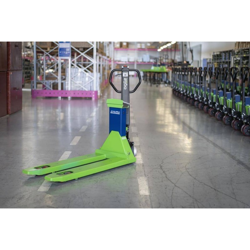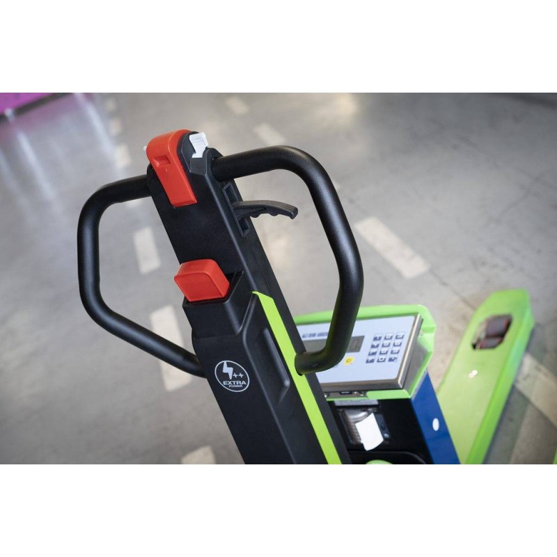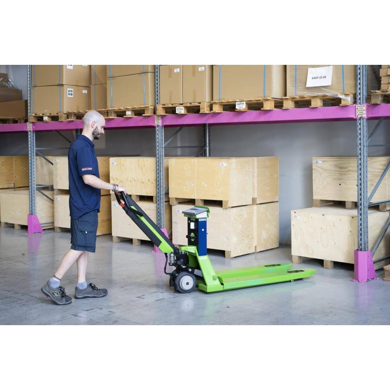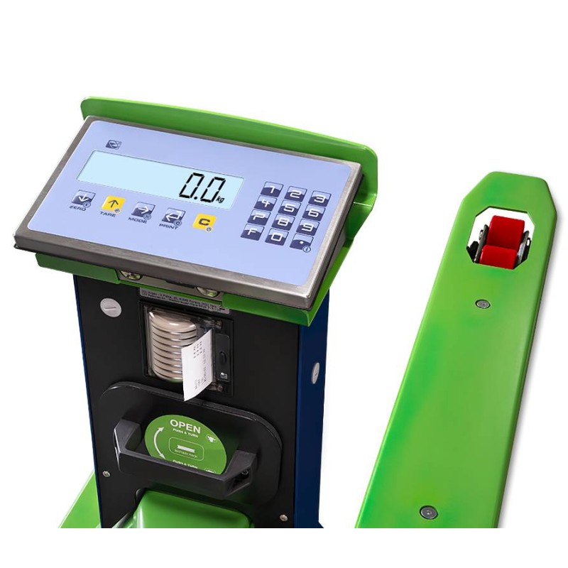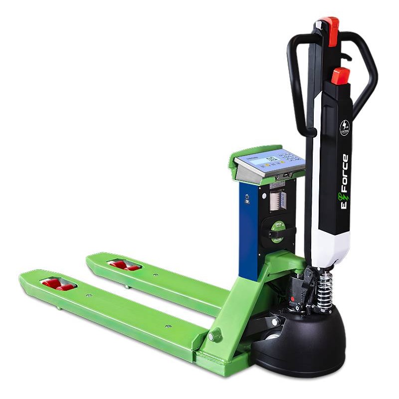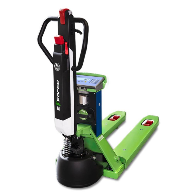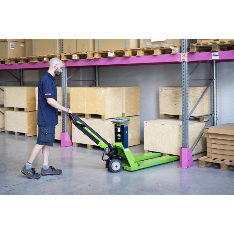 Transpallet pesatore dotato di timone a trazione elettrica. Un ottima compromesso tra le soluzioni completamente manuali e quelli elettriche, il TPWE-FORCE offre tutti i vantaggi della trazione a motore mantenendo la manegevolezza e praticità. Pesatore con 1200 kg di portata, 100 gr di risoluzione, stampante di serie, completa integrazione per industria 4.0. Ideale per GDO e logistica.