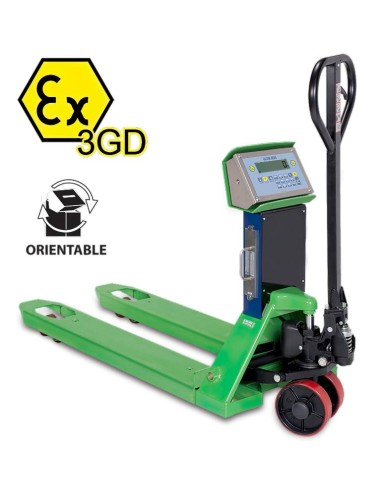 Transpallet Pesatore TPWX3GD certificato secondo direttiva ATEX, adatto per pesare in aree pericolose classificate a rischio di esplosione ZONA 2 e 22. Display inox IP68 che è possibile girare a +- 160° regolandolo quindi per le esigenze dell'utilizzatore.Alimentato con batteria industriale con durata elevata che va ricaricato in zona sicura ( fuori area Atex ).