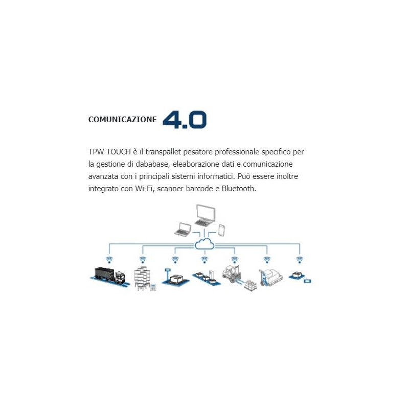 TPWTS TOUCH è il transpallet pesatore professionale specifico per la gestione di database, elaborazione dati e comunicazione avanzata con i principali sistemi informatici. Può essere inoltre integrato con Wi-Fi, scanner barcode e Bluetooth.