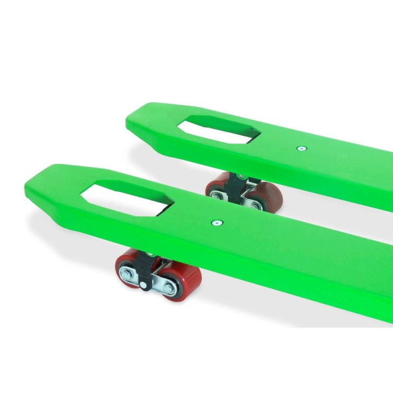 Dimensioni forche 1150 x 550 x 85 mm. Struttura in acciaio di forte spessore, verniciata a forno. Ruote di guida e doppie ruote di carico in poliuretano. Forche a profilo ribassato, altezza di soli 85 mm.